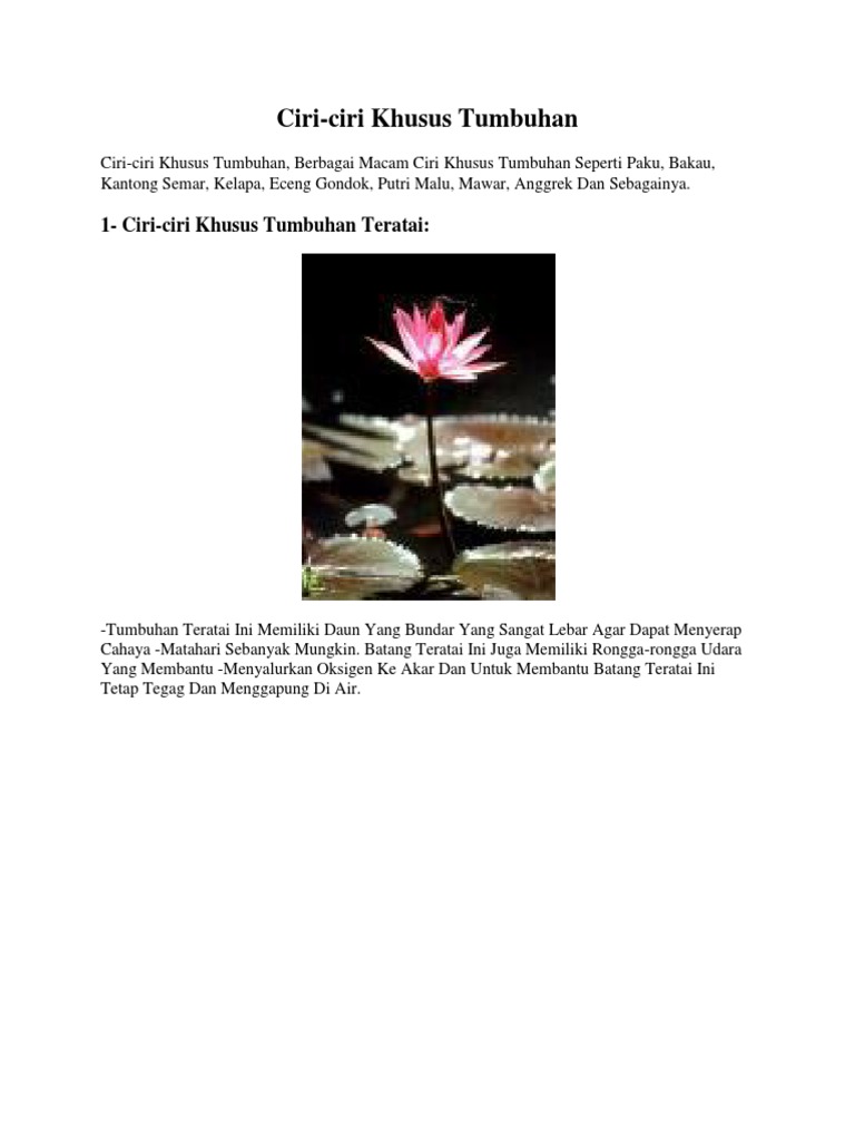 Berikut ini adalah inilah ciri khusus tumbuhan teratai dan fungsinya: Ciri khusus bunga melati memberi keistimewaan tersendiri pada bunga dengan wangi semerbak ini. Ciri khusus yang dimiliki oleh bunga matahari adalah bunganya selalu mengikuti ke mana arah matahari. Hal khusus tentang tanaman bunga matahari ialah bunga tersebut yang selalu mengikuti arah matahari, dan karenanya tanaman ini disebut sebagai bunga matahari. Ciri khusus dari tanaman ini adalah mahkota bunganya mekar yang mengikuti.